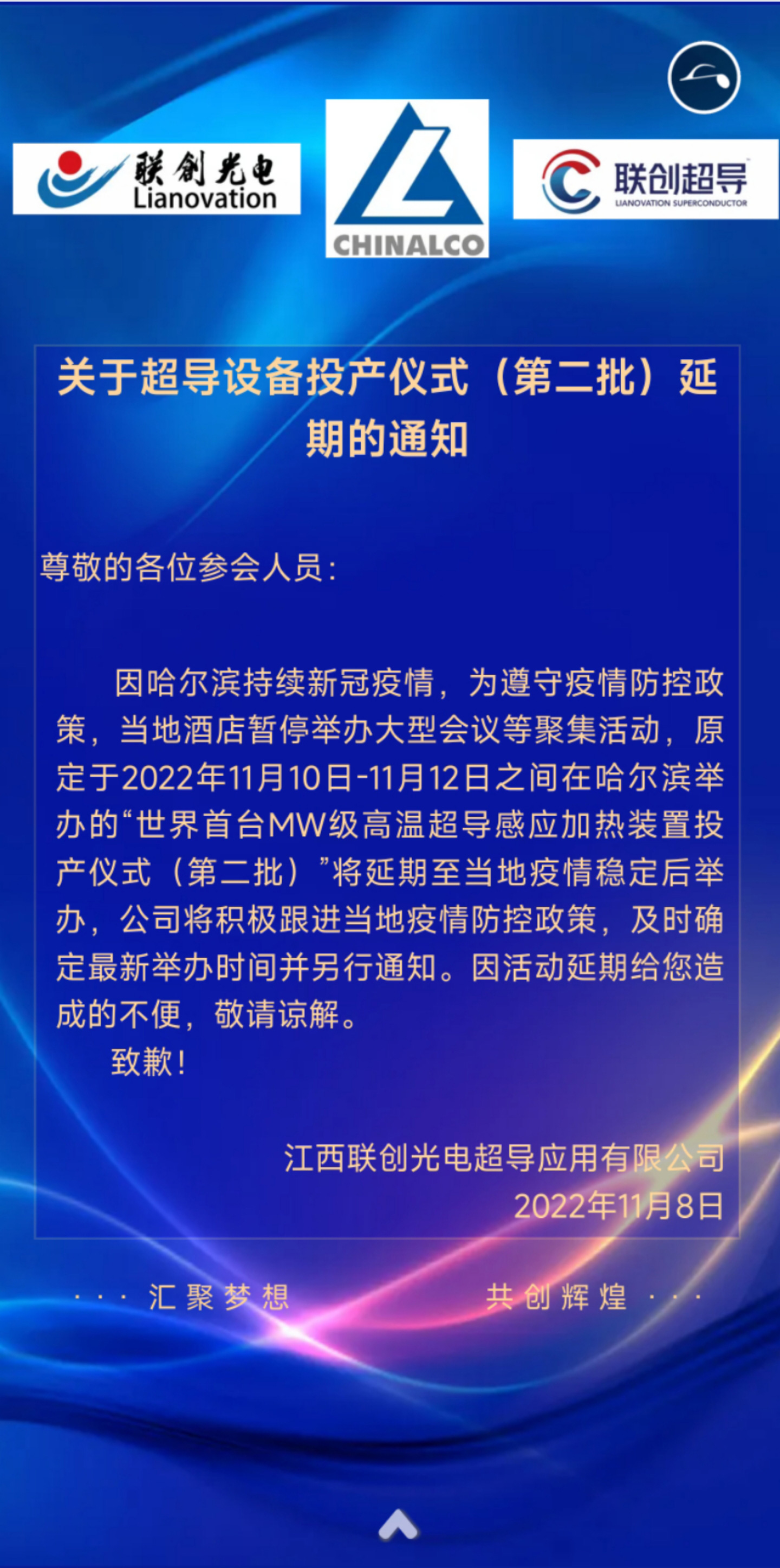 關于超導設備投產(chǎn)儀式(第二批)延 期的通知