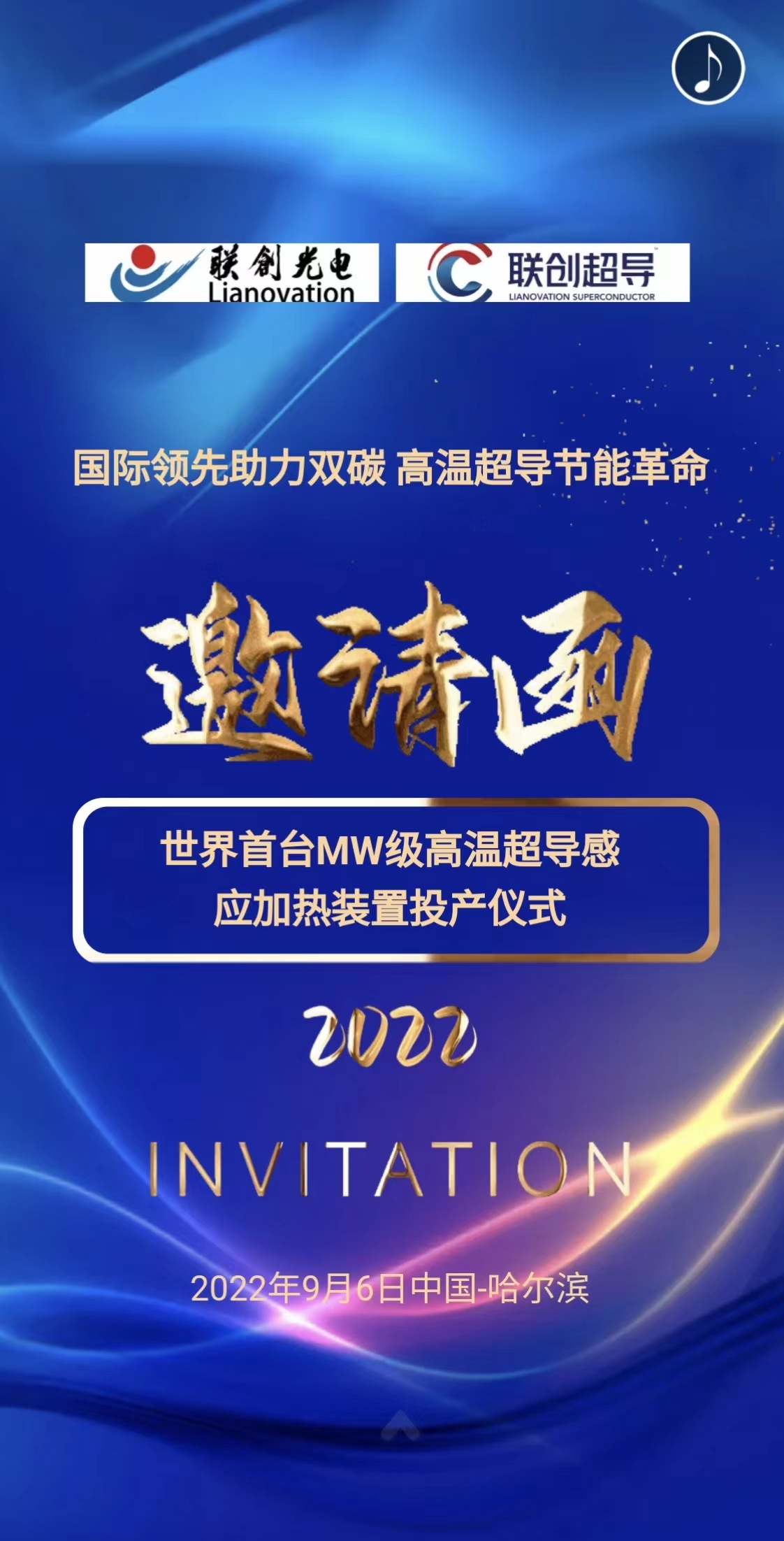 十年磨一劍,一朝試鋒芒!聯(lián)創(chuàng)高溫超導歷經(jīng)近十年的科技長投,傾心打造的高溫超導感應加熱設備,超導設備于今年3月完成驗收,聯(lián)創(chuàng)高溫超導即將開啟商用的新征程。我們在求真創(chuàng)新、產(chǎn)業(yè)報國的道路上,離不開諸位的鼎力協(xié)助,為感謝諸位對聯(lián)創(chuàng)超導的信任與支持,公司將于2022年9月6日在哈爾濱舉辦“MW級高溫超導感應加熱裝置投產(chǎn)儀式”。屆時特邀嘉賓、行業(yè)專家、公司高管將介紹設備作業(yè)情況及公司高溫超導設備的發(fā)展戰(zhàn)略,這將是高溫超導近期最受矚目的重要盛會。為此,我們誠摯邀請您來參與我們的盛會!