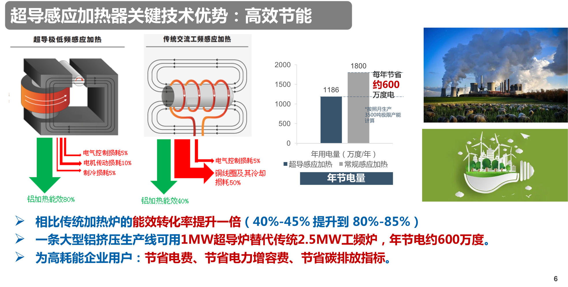 高效節(jié)能是這種加熱方法的最突出優(yōu)勢。傳統(tǒng)的工頻爐,大量的熱能消耗在產(chǎn)生磁場的銅線圈上,并沒有注入工件體內(nèi),因此加熱效率只有不到50%。超導(dǎo)感應(yīng)加熱,由于其零電阻特性,產(chǎn)生強磁場只消耗些低溫制冷損耗,加上機械傳動損耗在內(nèi),總損耗不會超過20%,因此可以將加熱能效大幅提升到80%以上。這就意味著一臺1mw的超導(dǎo)爐可以替代掉傳統(tǒng)2.5兆瓦的工頻爐,一年運行可為客戶節(jié)省600萬度電,除此之外,還能節(jié)省電力增容費,和未來的碳排放指標(biāo)。