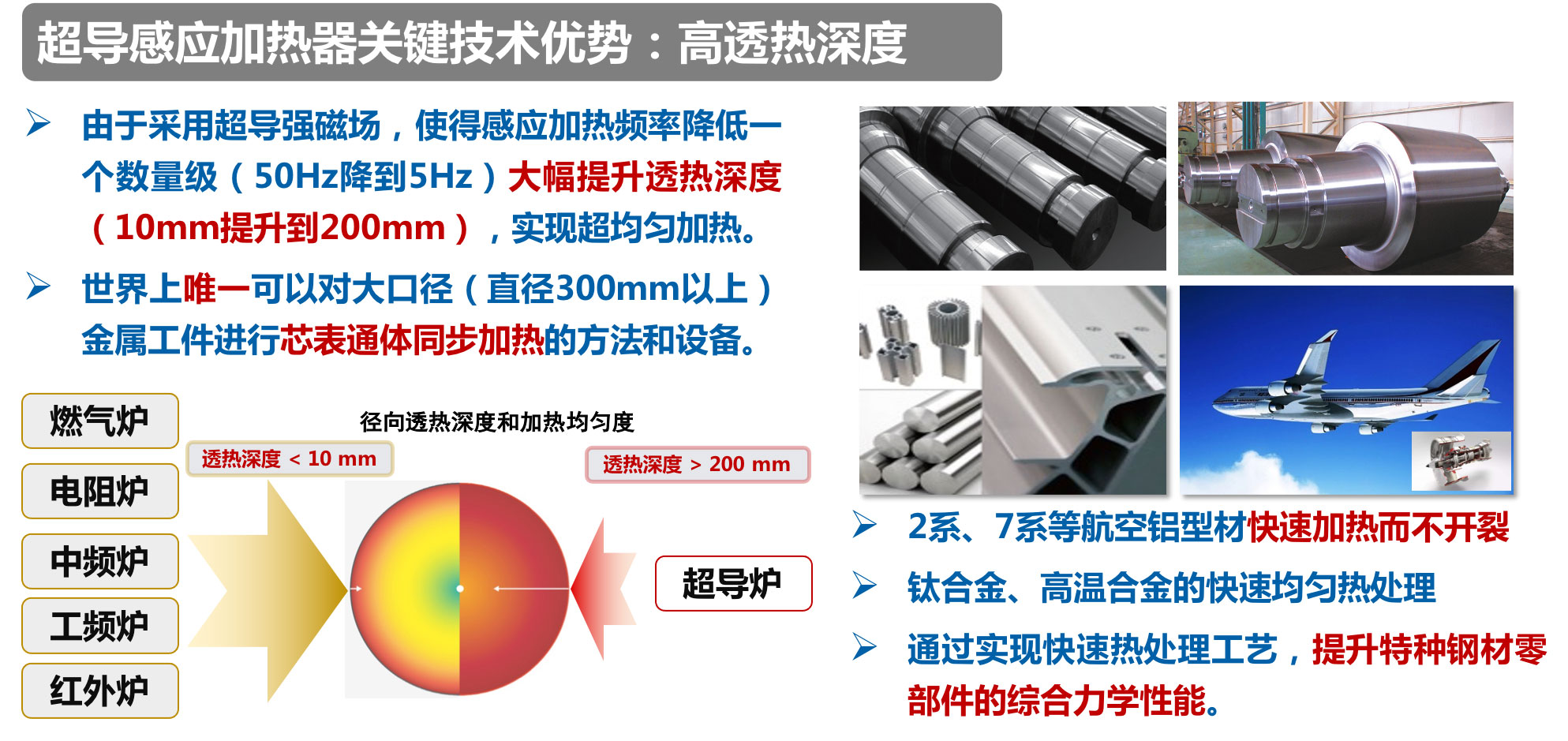 高溫超導(dǎo)感應(yīng)加熱技術(shù)是金屬熱處理領(lǐng)域的變革性技術(shù)創(chuàng)新,是金屬熱加工,熱處理領(lǐng)域的一個顛覆性產(chǎn)品。它有望將傳統(tǒng)工頻感應(yīng)爐的能效轉(zhuǎn)化率再提升一倍,即碳排放再減一半。另外,傳統(tǒng)工頻爐照比燃燒爐,并沒有解決透熱深度差的問題。工頻感應(yīng)爐的透熱深度只有7mm。